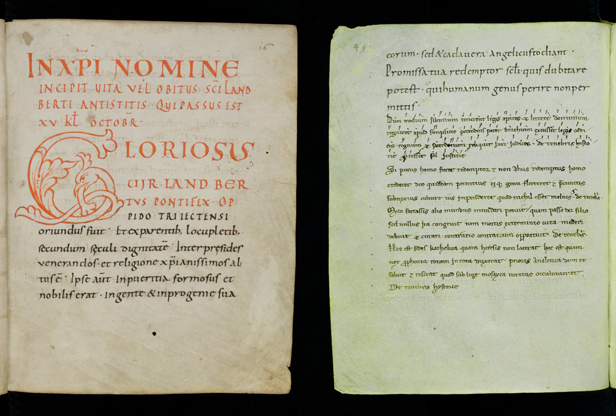 "In der Vita Sancti Landberti ist von anderer Hand S. 49 ein Glossenlied: 'Dum medium silentium' etc. (...)" eingetragen." (Gustav Scherrer (Hg.), Verzeichniss der Handschriften der Stiftsbibliothek von St. Gallen. Herausgegeben auf Veranstaltung und mit Unterstützung des Kath. Administrationsrathes des Kantons St. Gallen. Halle, Verlag der Buchhandlung des Waisenhauses, 1875, S. 170)