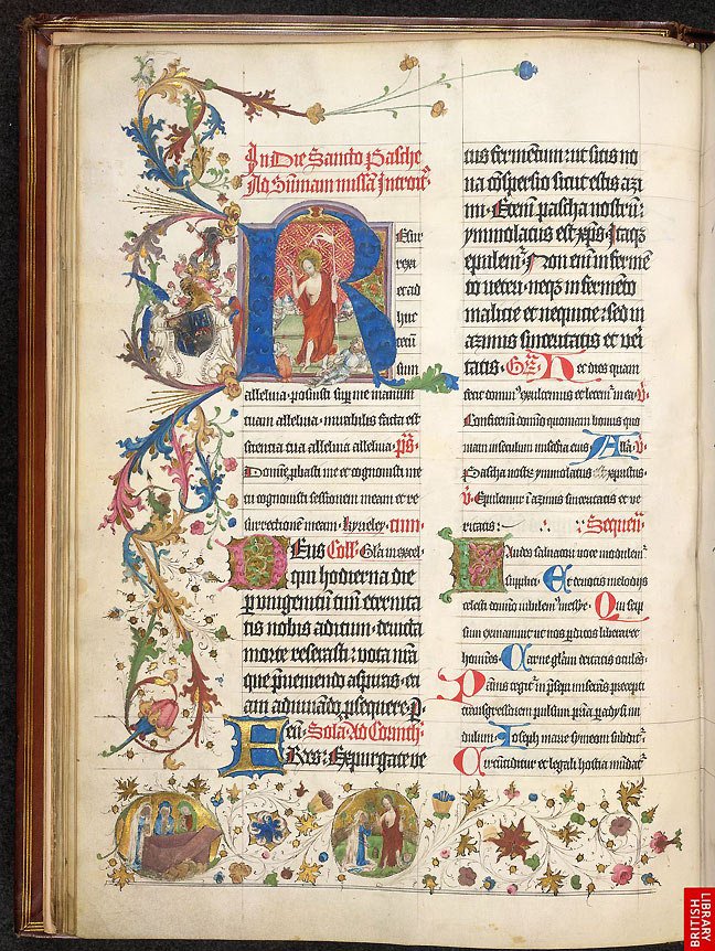 Die Illumination der Gesamtseite entspricht dem: In der Initiale der Auferstandene über den in Ohnmacht gefallenen Wächtern des Grabes, in den beiden Medaillons am Fuß der Seite links die drei Marien vor dem leeren Grab und rechts Maria Magdalena mit ihrem Salbentopf und der Auferstandene wie ein Gärtner mit dem Spaten in der Hand.