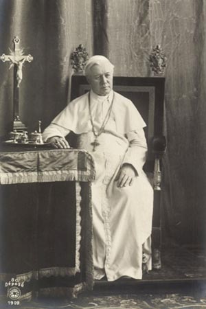 Pius X., Giuseppe Sarto (* 2. Juni 1835 - † 20. August 1914). Giuseppe Sarto wurde 1858 zum Priester geweiht. Seine Laufbahn begann er als Seelsorger auf dem Lande; er war zuerst Kaplan in Tombolo, dann ab 1867 Pfarrer in Salzano, acht Jahre später wurde er Domherr in Treviso, 1884 Bischof von Mantua und schliesslich wurde er 1893 zum Kardinal und bald darauf zum Patriarchen von Venedig ernannt. Nach dem Tode vom Papst Leo XIII. wurde er am 4. August 1903 im Konklave zum Papst gewählt. Sein Wahlspruch war: Instaurare omnia in Christo.