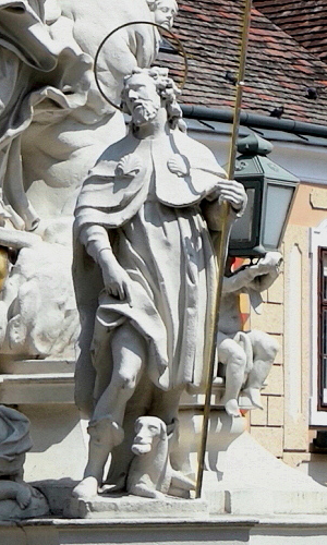Der Heilige wird häufig dargestellt mit Muschelhut und Pilgerstab, wie er an seinem entblößten Oberschenkel auf eine Pestbeule hinweist; bei ihm ist meistens ein Hund mit Brot. Er ist der Patron der Kranken, Gefangenen, Ärzte, Chirurgen, Totengräber ... und wird angerufen gegen Seuchen, Pest, Cholera, Tollwut. Ihm sollen in Italien 3000 Kirchen geweiht sein.