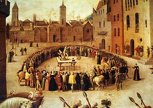 "Nachdem man sie unter den Galgen geschleift hatte, ließ man die Verurteilten einen nach dem anderen auf einen Karren steigen, der unter ihnen weggezogen wurde, so daß sie hingen; danach wurde sofort der Strick durchschnitten, und man richtete sie auf und stellte sie an einer dafür hergerichteten Stelle auf, um sie stehend zu erhalten und ihnen die Schamteile abzuschneiden, die ins Feuer geworfen wurden; man schnitt sie auf und riß ihnen die Eingeweide heraus, hierauf wurde ihnen der Kopf abgeschlagen und ihre Körper gevierteilt. Zuvor hatte man ihnen das Herz ausgerissen und ihnen damit Mund und Gesicht eingerieben."